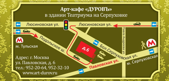Друзья! В связи с реконструкцией фойе, вероятно, главный вход арт-кафе "Дуровъ" будет закрыт. Поэтому входить будем через служебный. Схема тут: http://art-durov.ru/news/724.html