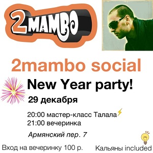 Прошёл ещё один месяц, а значит суббота 29 декабря — время для традиционного social в 2mambo. Дата обязывает — Новый год на носу, так что можно начинать поздравлять друг друга, дарить подарки и начинать веселье, которое некоторые продолжат в Ростове, некоторые в Красноярске. И как раз проездом из Брюсселя на фестиваль в Красноярск в качестве новогоднего сюрприза к нам заглянет Талал, который проведет мастер-класс по сальсе NY до вечеринки, и, естественно, останется потанцевать и попраздновать. Классическая часть программы: лучшие в городе мамбос, ча-ча-ча и прочая пачанга, самый ровный пол, самые удобные диваны для посидеть, кальяны для покурить и прочие радости social dance и не только. Мастер-класс Талала:
