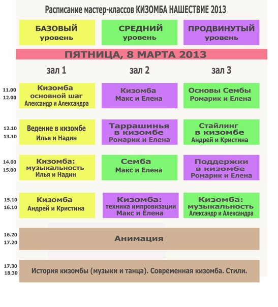 Всем-всем-всем! 20 февраля закрывается регистрация на фестиваль! Зарегистрироваться можно у представителя в вашем городе или написать письмо на почту kizomba.nashestvie@mail.ru (для регистрации необходимо имя и фамилия, контактный телефон, адрес электронной почты и уровень подготовки - начальный, средний, продвинутый) Ждем Вас! Продолжаем радовать свеженькими новостями! Все мастер-классы будут проходить по адресу: Адрес: ул. Малая Ордынка 25, "Ордынский" офисный комплекс, ст.м. Третьяковская (позже выложим подробное объяснение пути с фото отчетом). Расписание мастер-классов на пятницу, 8 марта 2013 Attachment 276 |