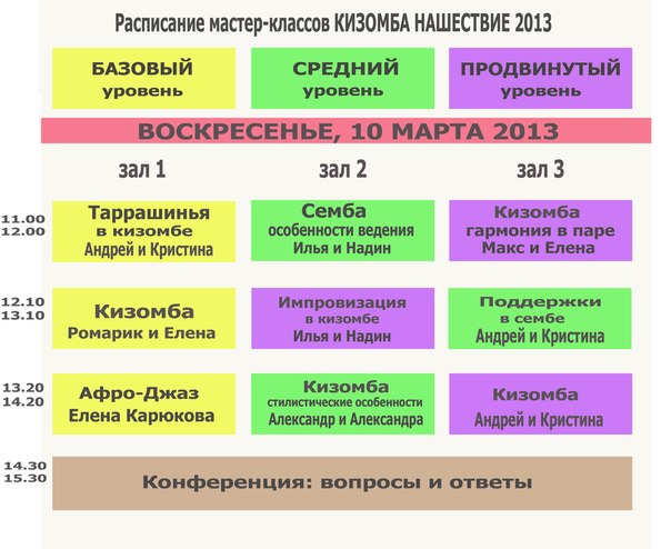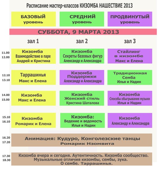 Расписание лекций для преподавателей: пятница, 8 марта - 22.00-23.00 малый зал. Старый Арбат, д.11 (перед вечеринкой) суббота, 9 марта - 18.30-19.30 Малая Ордынка, 25 (после общей лекции) воскресенье, 10 марта - 15.30-16.30 Малая Ордынка, 25 (после конференции) Темы для обсуждений: Организация занятия. Фазы занятия. Структура занятия. Методика и методология преподавания. Система уровней развития группы. Аутентичность - за и против. Обсуждение путей и стратегий развития кизомбы (попузяризация кизомбы) в России и СНГ. Кизомба сообщество в России и СНГ |