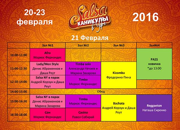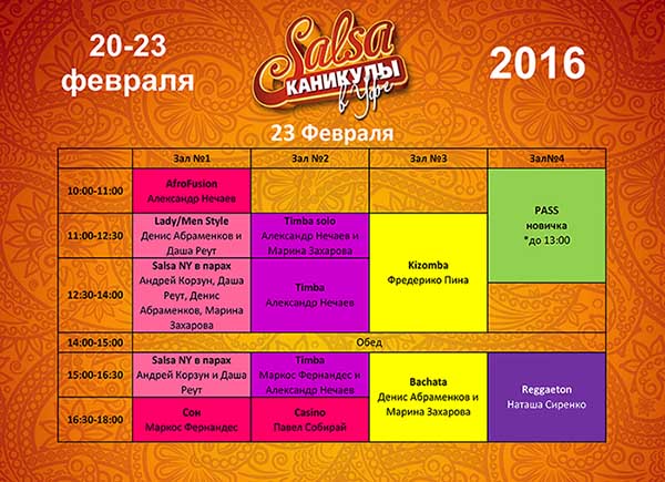 20.02 отвязная вечеринка GANGSTA PARTY https://vk.com/topic-114523222_33759243 21.02 вечеринка в стиле джаз TAKE FIVE https://vk.com/topic-114523222_33759236 22.02 вечеринка по мотивам советского кино "ОПЕРАЦИЯ "Ы" или ..." https://vk.com/topic-114523222_33759231 В программе: * 2 Зала: Salsa/Bachata и Kizomba * Конкурсы! * Dj из разных городов! * Все гости фестиваля! Приглашенные звезды и преподаватели! Стоимость: - 500 рублей (1 вечеринка), - party-pass (3 вечеринки) - 1100, - обладателям pass'ов Сальса-каникул в Уфе - бесплатно! Хотите выиграть Party-PASS - зайдите вконтакт и сделайте репост записи https://vk.com/event114523222?w=wall-114523222_7%2Fall Last edited by TonyLeon : 15.02.2016 at 12:27. |
