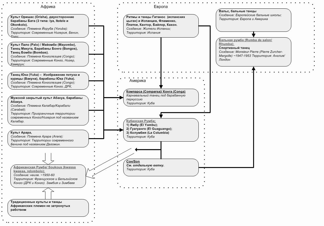 Предлагаю всё делать по порядку, а не "растекаться мысью по древу"!Первое - сделаем всю схему по веточкам, а потом соберём в единое целое. Веточки буду делать максимально подробными. Целое - будет общим (только связи и приблизительные сроки возникновения). Ветка 1 - Румба. Жду замечаний и предложений Прим.: мои источнкик - интернет. ![]() Следующий соберём сон,
